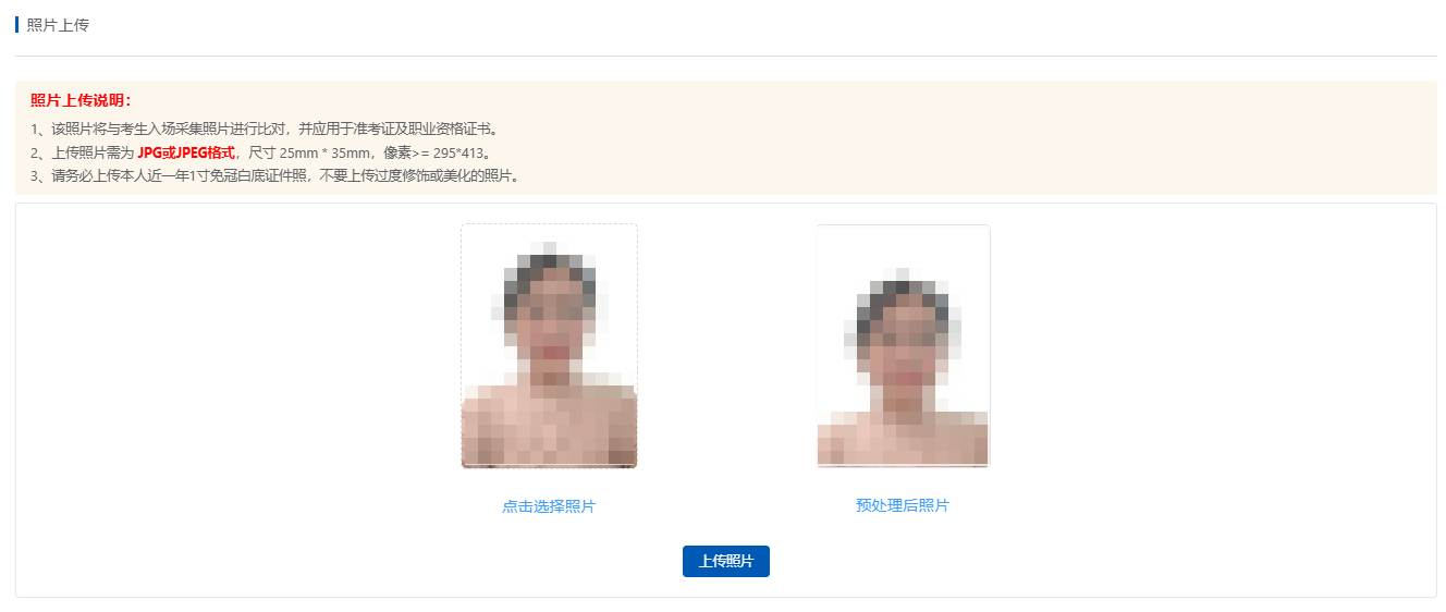 1、该照片将与考生入场采集照片进行比对,并应用于准考证及职业资格证书。