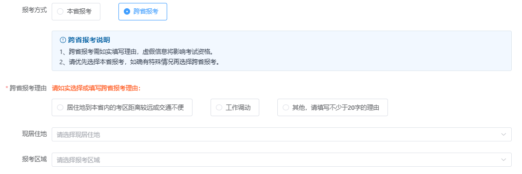 1、跨省报考需如实填写理由,虚假信息将影响考试资格。