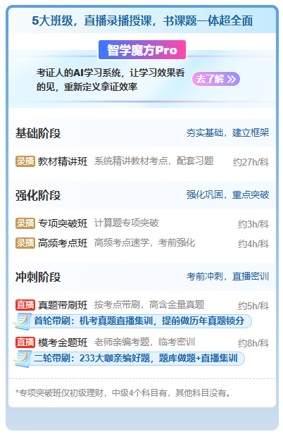 自己学的枯燥,抓不到重点?零基础看得云里雾里?欢迎报考233网校系统课程——智学魔方pro,不仅有27小时的教材精讲系统课,而且还在强化阶段和冲刺阶段有相应的强化班和冲刺班,并且购课赠送V2题库会员+纸质版教辅+电子资料,“课+题+资料”全搞定,让你可以安心备考!立即试听&报课>>