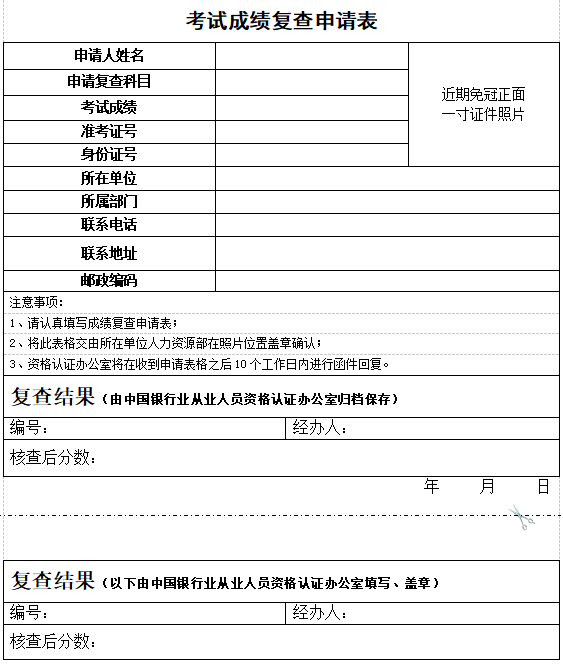银行从业考试成绩复查申请表包含姓名、证件号、联系方式、报考级别、电子邮箱、准考证号、复查科目等信息,如下: