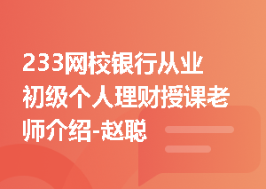 233网校银行从业初级个人理财授课老师简介赵聪【点击试听老师课程】老师资历:233网校银行从业独家网课签约老师。AFP持证人,经济师,注册融资规划师,银行业协会特聘讲师授课科目:初级-个人理财赵聪老师原为某985高校金融讲师;中国工商银行、中信银行、中国人寿保险公司、中泰证券、中国邮政集团等多家机构特聘内训讲师;专业从事AFP、CFP、银行从业资格、基金销售、公开立项中级经济师培训项目并担纲主讲人。从教16年,金融培训近12年,累计培训学员40,000余人。233网校银行从业课程配套服务1、考试查看更多>
