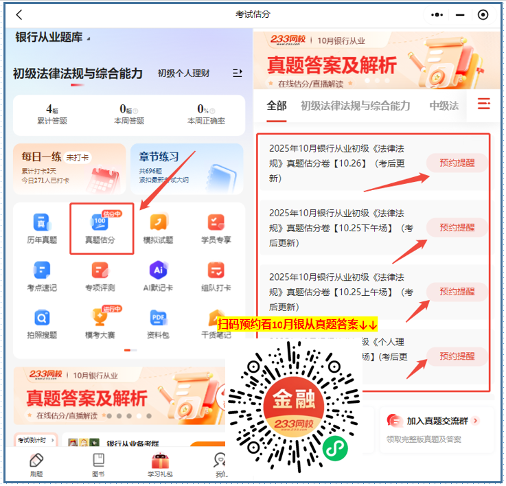 233网校会在考后及时发布2025年10月银行从业考试真题,现在看真题估分预约通道已开启!