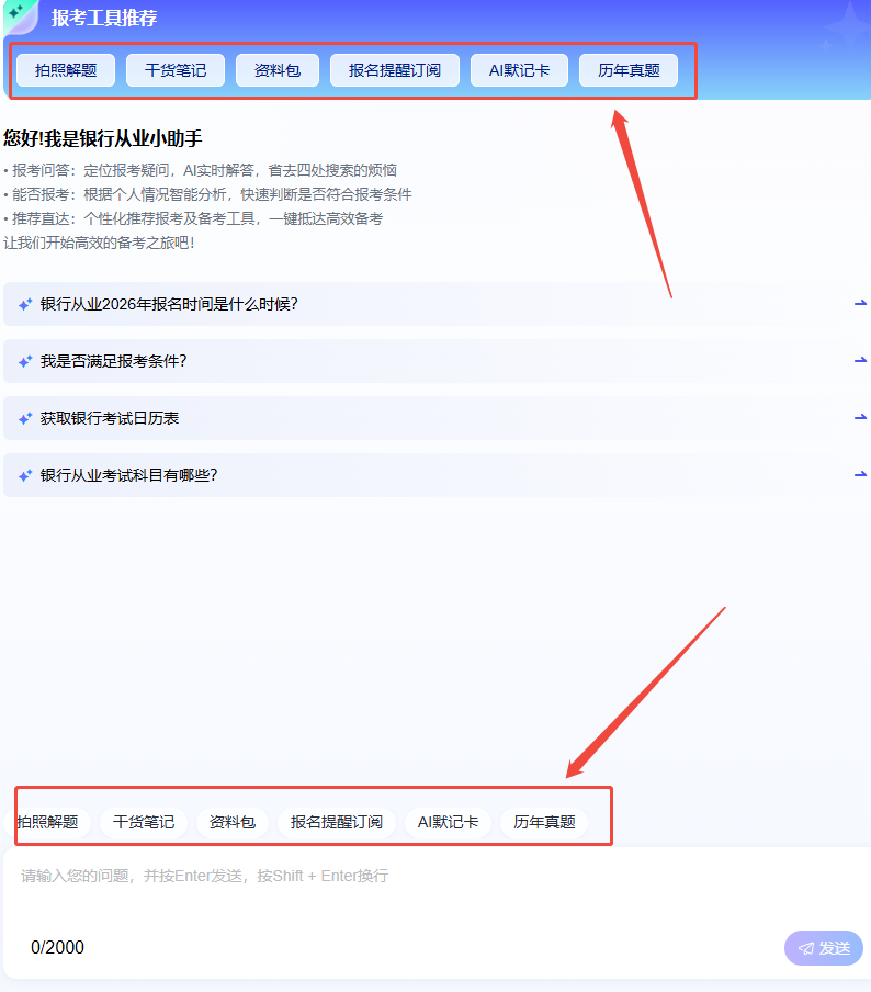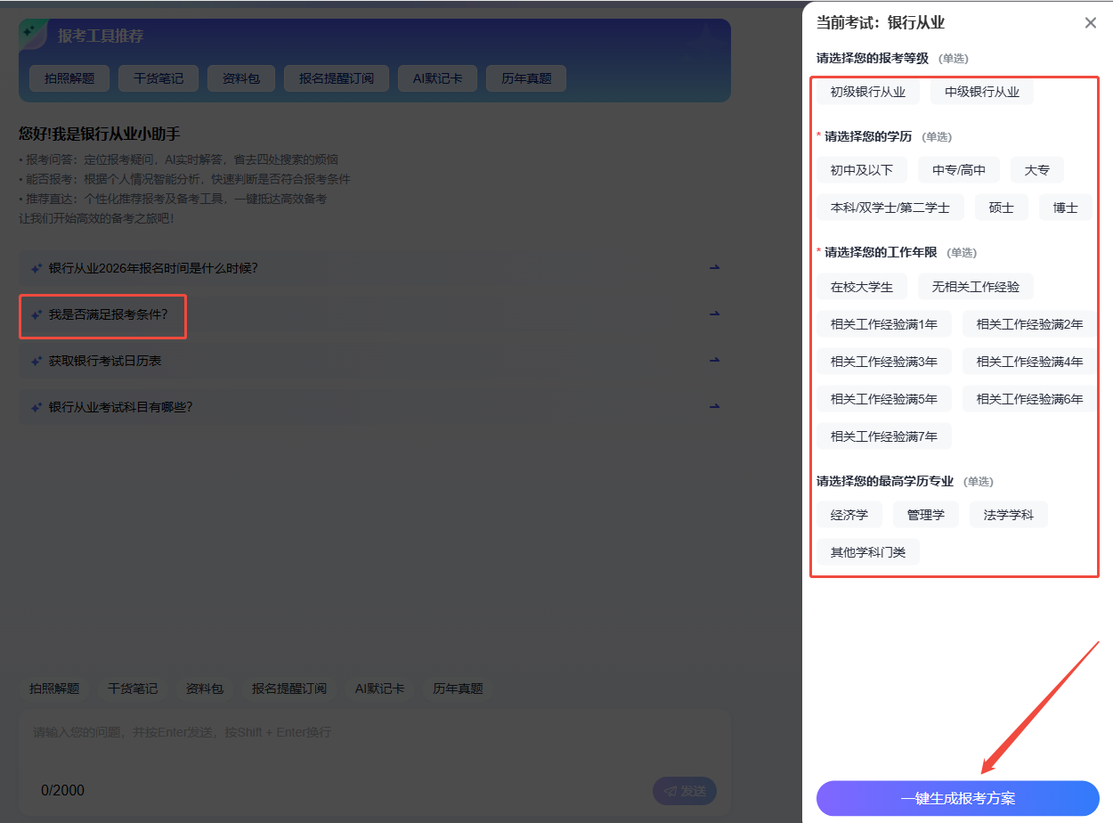 银行从业考试竞争日趋激烈,高效备考路径能帮你脱颖而出。AI 智能报考助手以科技赋能,用专业问答、精准核验、个性化推荐,扫清报考障碍,让你聚焦核心复习。 无需再为政策焦虑、为资源费心,AI 智能报考助手全程陪伴,让备考每一步都扎实有序。现在开启智能报考体验,让银行从业备考之路更顺畅、更高效!