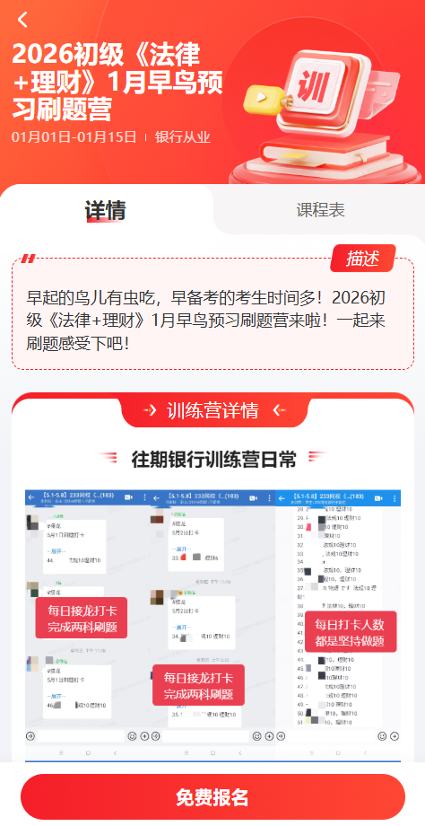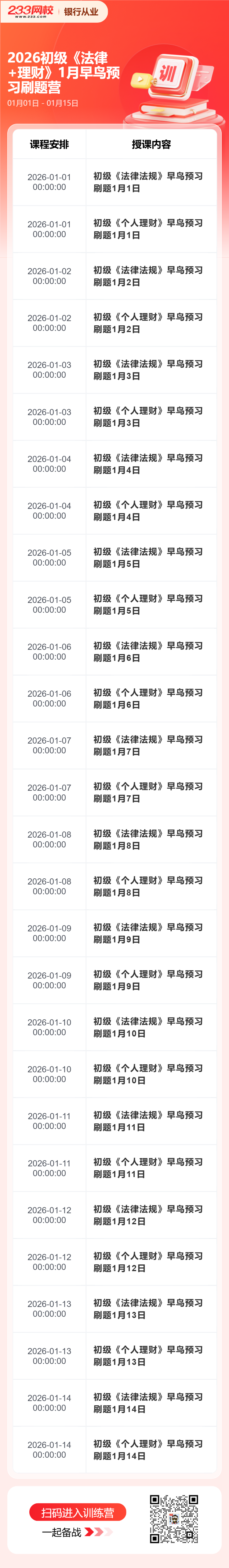 233网校银行学霸君为大家准备了《1月早鸟预习刷题营》(1.1-1.14)!备考初级《法律法规+个人理财》的同学,一起来刷题感受下吧!你只需要跟着训练营节奏,每天抽出10分钟,刷15道题/科,就非常棒了!速来报名!免费!免费!免费!
