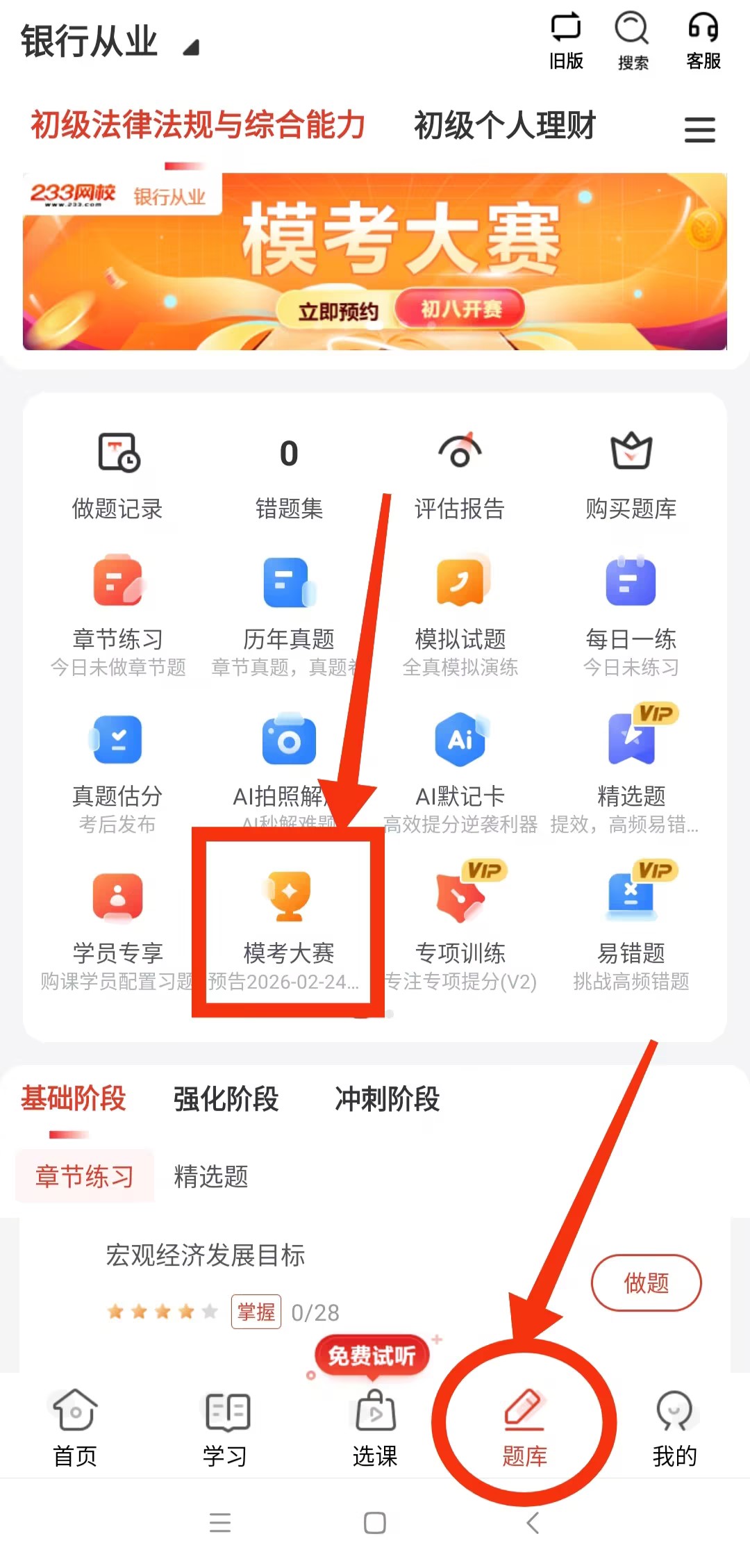 第一步:打开【233网校APP】——【银行从业】——底部【题库】——【模考大赛】。