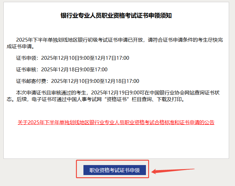 更多单独划线地区证书申请详情可点击下载>>2025年下半年单独划线地区银行业专业人员职业资格证书申领须知.pdf