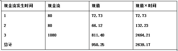 例如,某种固定收入债券的息票为每年80元,偿还期为3年,面值为1000元。该金融工具的实际收益率(市场利率)为10%,现行价格为950.25 元。求该债券的久期。在久期计算中,先计算每期现金流的现值,然后每个现值乘以相应的发生时间,再把各项乘积相加,并除以该债券的市场价格,就得到该债券 的久期。