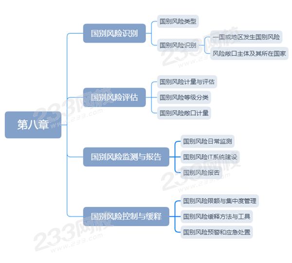 为了使银行从业资格考试考生备考更方便,学习更轻松,学霸君根据2019年的考试大纲(2020年考试大纲暂时未出)为各位小伙伴准备了银行从业初级《风险管理》的思维导图,第八章内容:国别风险管理,具体如下: