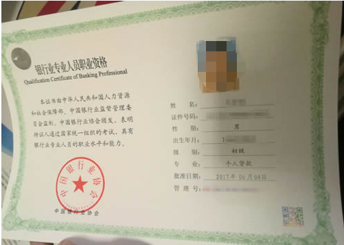 银行从业资格证是一种银行业的准入证书,由人力资源和社会保障部颁发,具体的式样如下图: