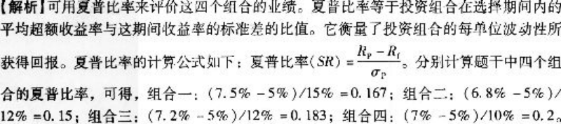 答察解析: 夏普比率等于投资组合在选择期间内的平均超额收益率与这期间收益率的标准差的比值。它衡量了投资组合的每单位波动性所获得回报。当投资人当前的投资组合为唯一投资时,用标准差作为投资组合的风险指标是合适的。