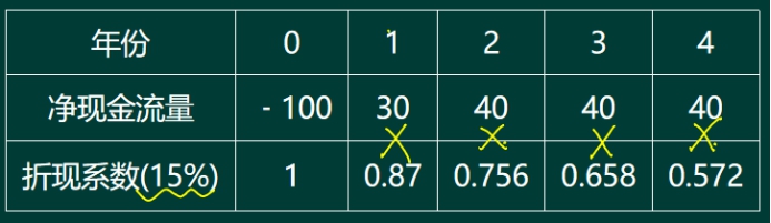 【解析】净现值=﹣100×1+30×0.87+40×0.756
