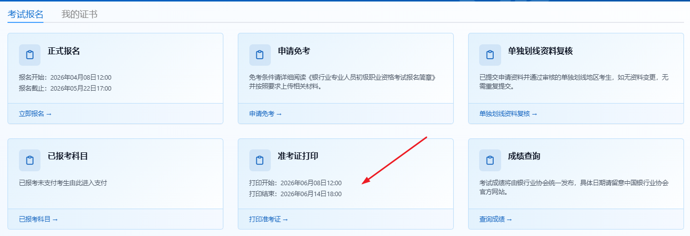 2026上半年银行从业资格证准考证打印时间为6月8日12点-6月14日18点,如未在规定时间内打印准考证,视为自愿弃考,将无法参加考试。建议大家尽快打印好。
