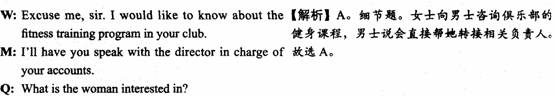 系统解析:细节题。对话中男士提到"And it's the travel that ap.peals to me.”也就是说吸引男士的是旅游机会。男士并没有对报酬发表看法,工作时间很长,但并没有提到是否灵活。升职前景对话中也没有提到。故选A。