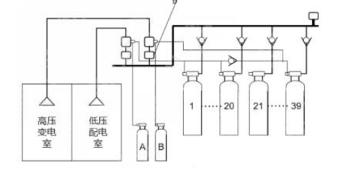 21、某证券公司大楼的地下一层,建筑面积为4000㎡,层高为4m,设置了机械排烟和机械补风系统,高压变电室、低压配电室共用一套组合分配IG541混合气体灭火系统组成示意图见下图,火灾报警控制器、气体灭火控制器安装在同层消防控制室内。消防控制室与低压配电室的值班室合用。