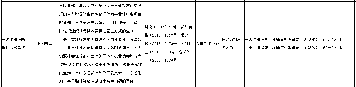 山东烟台高新区财政金融部2022年4月份更新烟台市考试考务费项目目录清单(2022年4月更新),其中一级注册消防工程师资格考试由人力资源和社会保障部管理,一级注册消防工程师考试报名收费标准:客观题:65元/人.科,主观题:69元/人.科。