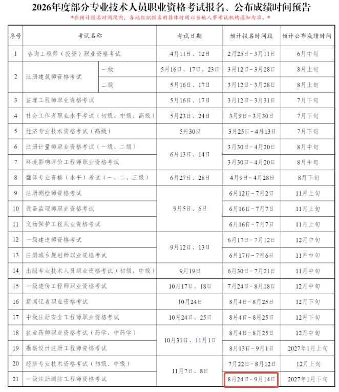 2月28日,中国人事考试网发布了《2026年度专业技术人员职业资格考试重要事项提示》,明确2026年一级消防工程师报名时间8月24日-9月14日,相比往年,报名提前,详情如下: