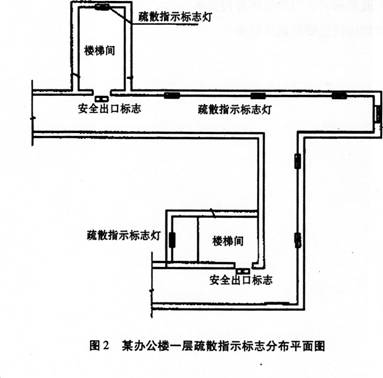 22、 在对某建筑高度为67.6m的一类高层办公楼的疏散指示标志和应急照明验收时,工作人员通过现场测量画出了一层疏散指示标志的分布草图,如图2所示。另外,检查中发现的消防应急灯具离地面1.5m,通过插头与供电线路连接,分配线路采用燃烧性能为B1级的电缆明装;系统的应急转换时间为6s。请分析该建筑物疏散指示标志和应急照明设置的不妥之处。