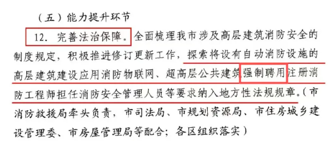 探索将设有自动消防设施的高层建筑建设应用消防物联网、超高层公共建筑强制聘用注册消防工程师担任消防安全管理人员等要求纳入地方性法规规章。