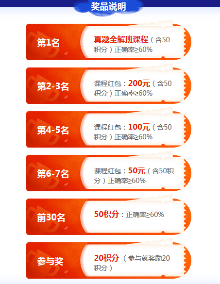 4、一个帐号只能拿一次该科目下的真题全解班课程奖品,且考试成绩得分必须在60%以上才可以拿奖品。