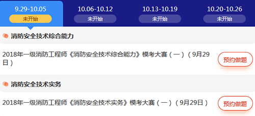 2018届一级消防工程师模考大赛为233网校APP用户专享!共设4场,9月29日开赛,每场时间分别是第一场9月29日-10月5日,第二场10月6日-10月12日,第三场10月13日-10月19日,第四场10月20日-10月26日。设有《消防安全技术实务》和《消防安全技术综合能力》两个科目,大家可以在页面点击“预约做题”按钮,那么开赛之时便可收到提醒通知,以免错过!附图如下: