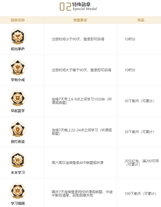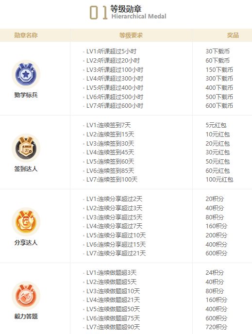 等级勋章——勤学标兵、签到达人、分享达人、毅力答题。