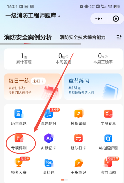 如使用过【233网校建筑类考证题库】小程序的同学,可以直接从小程序首页进入【专项测评】。