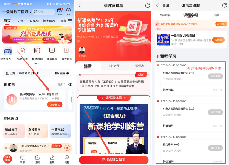 APP学习路径:233网校APP—训练营—《综合能力》新课抢学训练营—免费报名-添加老师开启学习之旅-已报名进入学习-(4.13后)立即听课