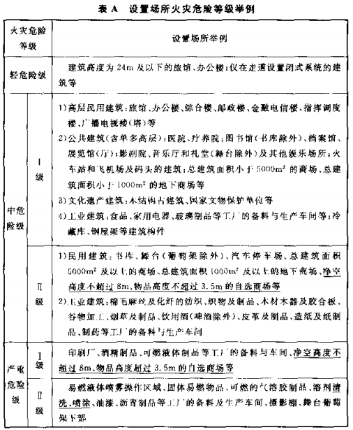 3.0.2 设置场所的火灾危险等级,应根据其用途、容纳物品的火灾荷载及室内空间条件等因素,在分析火灾特点和热气流驱动喷头开放及喷水到位的难易程度后确定。举例见本规范附录A。