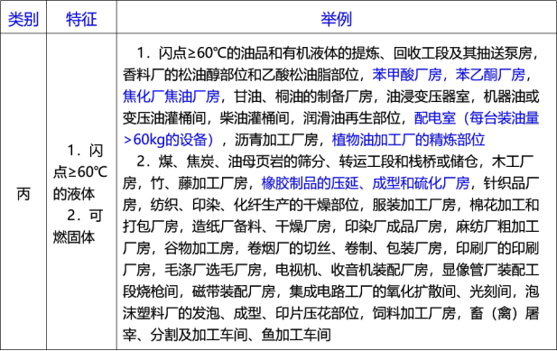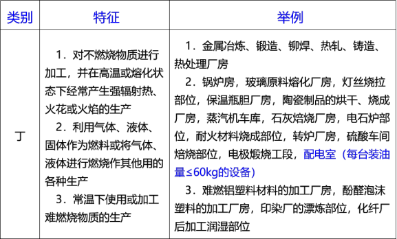 戊 | 常温下使用或加工不燃烧物质的生产 | 制砖车间,石棉加工车间,卷扬机室,不燃液体的泵房和阀门室,不燃液体的净化处理工段,金属(镁合金除外)冷加工车间,电动车库,钙镁磷肥车间(焙烧炉除外),造纸厂或化学纤维厂的浆粕蒸煮工段,仪表、器械或车辆装配车间,氟利昂厂房,水泥厂的轮窑厂房,加气混凝土厂的材料准备、构件制作厂房 |