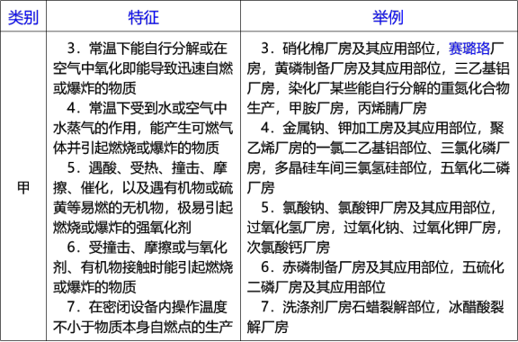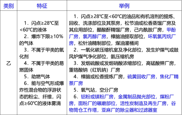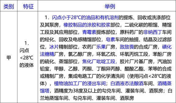 甲 | 2.爆炸下限<10%的气体 | 2.乙炔站,氢气站,石油气体分馏(或分离)厂房,氯乙烯厂房,乙烯聚合厂房,天然气、石油伴生气、矿井气、水煤气或焦炉煤气的净化(如脱硫)厂房压缩机室及鼓风机室,液化石油气罐瓶间,丁二烯及其聚合厂房,醋酸乙烯厂房,电解水或电解食盐厂房,环己酮厂房,乙基苯和苯乙烯厂房,化肥厂的氢氮气压缩厂房,半导体材料厂使用氢气的拉晶车间,硅烷热分解室 |