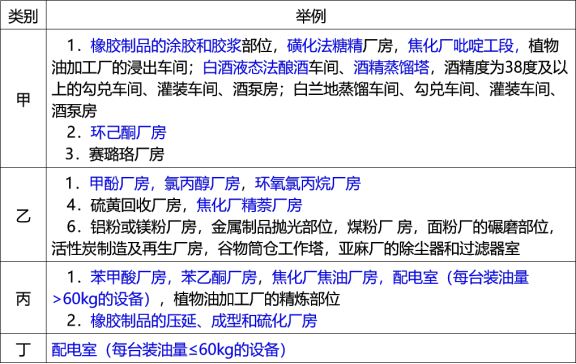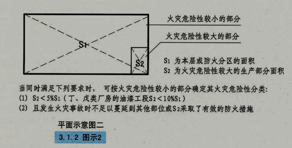 注:同一座厂房或厂房的任一防火分区内有不同火灾危险性生产时,火灾危险性类别应按火灾危险性较大的部分确定。当生产过程中使用或产生易燃、可燃物的量较少不足以构成爆炸或火灾危险时,可按实际情况确定;当符合下述条件之一时,可按火灾危险性较小的部分确定: