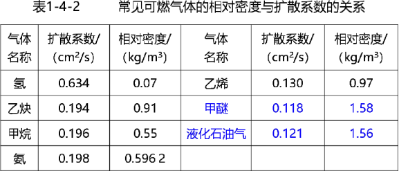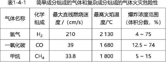 (2)—般来说,由简单成分组成的气体[如氢气(H2)]比复杂成分组成的气体[如甲烷(CH4)、一氧化碳(CO)等]易燃,燃烧速度快,火焰温度高,着火爆炸危险性大。简单成分气体和复杂成分气体的火灾危险性见表1-4-1。