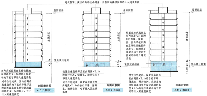 6、对于住宅建筑,设置在底部且室内高度不大于2.2m的自行车库、储藏室、敞开空间,室内外高差或建筑的地下或半地下室的顶板面高出室外设计地面的高度不大于1.5m的部分,可不计入建筑高度。