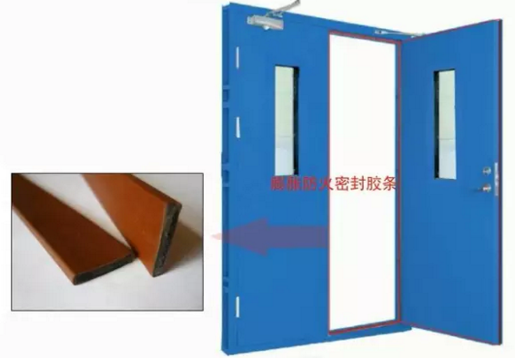 防火门门框与门扇、门扇与门扇的缝隙处应嵌装防火密封件。比如:膨胀防火密封胶条等。(防火密封件应经国家认可授权检测机构检验合格)