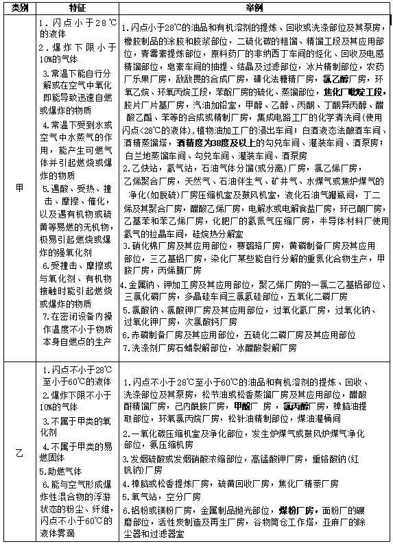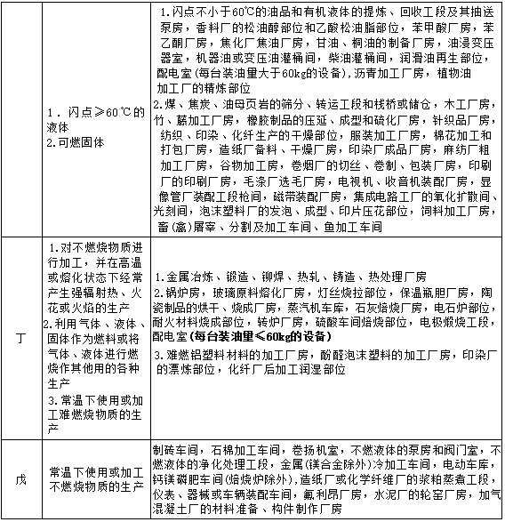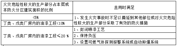 注:同一座厂房或厂房的任一防火分区内有不同火灾危险性生产时,火灾危险性类别应按火灾危险性较大的部分确定。当生产过程中使用或产生易燃、可燃物的量较少不足以构成爆炸或火灾危险时,可按实际情况确定;当符合下述条件之一时,可按火灾危险性较小的部分确定: