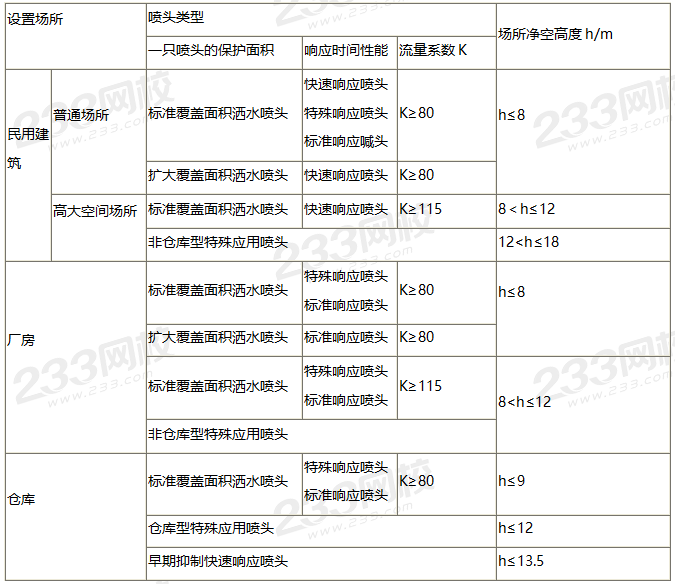设置闭式系统的场所,所选洒水喷头的类型和场所的最大净空高度应符合下表的规定,但仅用于保护室内钢屋架等建筑构件的酒水喷头和货架内置酒水喷头,可不受此表规定的限制。