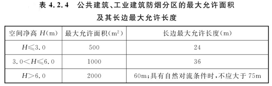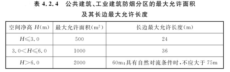4.2.4公共建筑、工业建筑防烟分区的最大允许面积及其长边最大允许长度应符合表4.2.4的规定,当工业建筑采用自然排烟系统时,其防烟分区的长边长度尚不应大于建筑内空间净高的8倍。