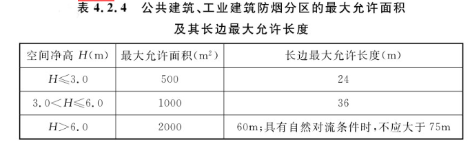 建筑防烟排烟系统技术标准 GB51251-2017 4.2.4 公共建筑、工业建筑防烟分区的最大允许面积及其长边最大允许长度应符合表4.2.4的规定,当工业建筑采用自然排烟系统时,其防烟分区的长边长度尚不应大于建筑内空间净高的8倍。