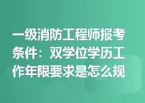 问:一级消防工程师报考条件中,关于双学位学历工作年限要求是怎么规定的?  答:一级消防工程师报考条件中关于双学位学历工作年限要求的规定如下:  取得含消防工程专业在内的双学士学位或者研究生班毕业,工作满3年,其中从事消防安全技术工作满2年;或者取得消防工程相关专业在内的双学士学位或者研究生班毕业,工作满4年,其中从事消防安全技术工作满3年。  取得其他专业相应学历或者学位的人员,其工作年限和从事消防安全技术工作年限均相应增加1年。  具体工作年限要求请看“一级消防工程师报考条件全解读”。查看更多>