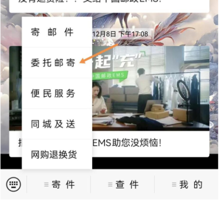 步骤一:关注“福建邮政EMS”微信公众号,选择“寄件”