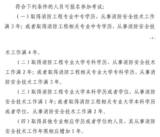(3)取得消防工程专业大学本科学历或者学位,从事消防安全技术工作满1年;或者取得消防工程相关专业大学本科学历或者学位,从事消防安全技术工作满2年。(4)取得其他专业相应学历或者学位的人员,其从事消防安全技术工作年限相应增加1年。