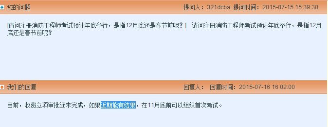 期待已久的消息终于有着落啦,工作人员在7月15号回复网友消息“收费立项审批还未完成,如果近期能有结果”,小编想重要报名及具体考试相关公告近期会出现了,随时关注233网校注册消防工程师站点,我们将会第一时间为你报道最新消息。