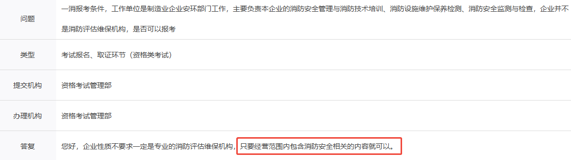 有考生在沈阳市考试院官网提问:一消报考条件,工作单位是制造业企业安环部门工作,主要负责本企业的消防安全管理与消防技术培训、消防设施维护保养检测、消防安全监测与检查,企业并不是消防评估维保机构,是否可以报考?