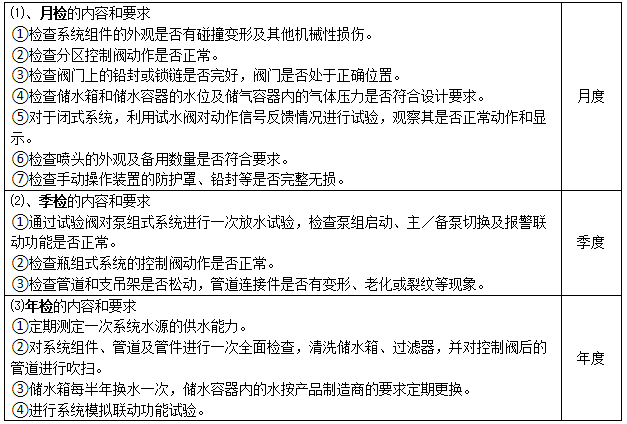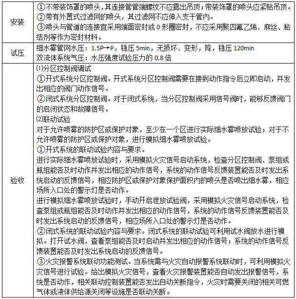 (1)拉索式机械驱动装置的安装要求:①拉索除必要外露部分外,应采用经内外防腐处理的钢管防护;②拉索转弯处应采用专用导向滑轮;③拉索末端拉手应设在专用的保护盒内;④拉索套管和保护盒应固定牢靠 (2)安装以重力式机械驱动装置时,应保证重物在下落行程中无阻挡,其下落行程要保证驱动所需距离,且不小于25mm (3)气动驱动装置的管道的安装要求:水平管道应采用管卡固定,管卡的间距不宜大于0.6m,转弯处应增设1个管卡【2016、2021】 (4)气动驱动装置的管道安装后,要进行气压严密性试验 ①气压严密性试验的试验压力为驱动气体储存压力 ②进行气密性试验时,应以不大于0.5MPa/s的升压速率缓慢升压至试验压力,关断试验气源3min内压力降不超过试验压力的10%为合格 |