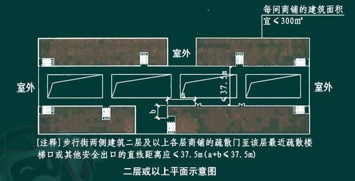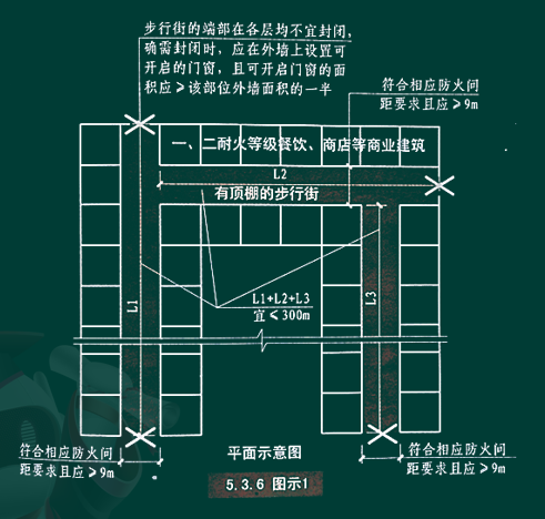 2.步行街两侧建筑相对面的最近距离均不应小于本规范对相应高度建筑的防火间距要求且不应小于 9m
