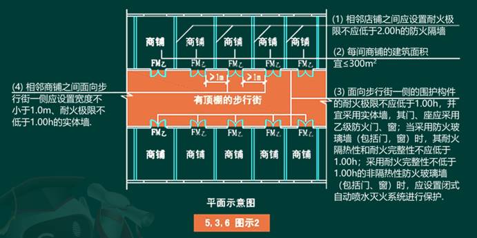 ③相邻商铺之间面向步行街一侧应设置宽度不小于1m,耐火极限不低于1.00h的实体墙。