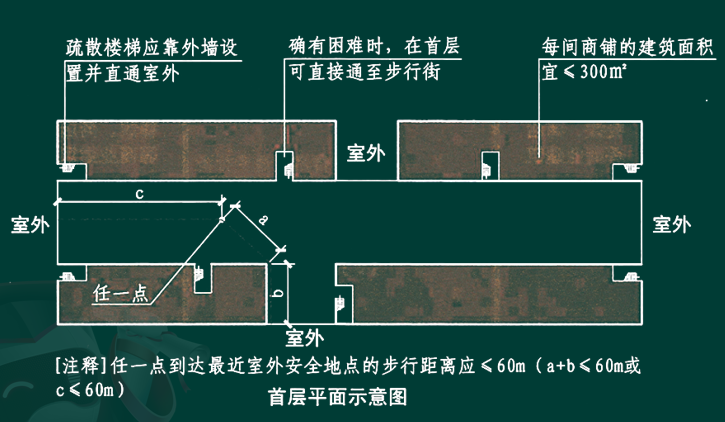 3.步行街两侧建筑内的疏散楼梯应靠外墙设置并宜直通室外,确有困难时,可在首层直接通至步行街;首层商铺的疏散门可直接通至步行街,步行街内任一点到达最近室外安全地点的步行距离不应大于 60m。