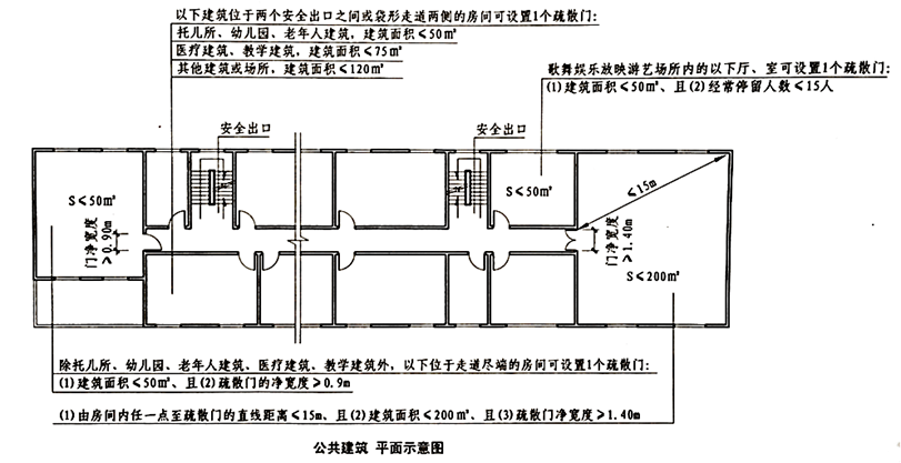 建筑中的疏散出口应分散布置,建筑内每个防火分区或一个防火分区的每个楼层、每个住宅单元每层相邻两个安全出口以及每个房间相邻两个疏散门最近边缘之间的水平距离不应小于5m。房间疏散门应直接通向安全出口,不应经过其他房间。
