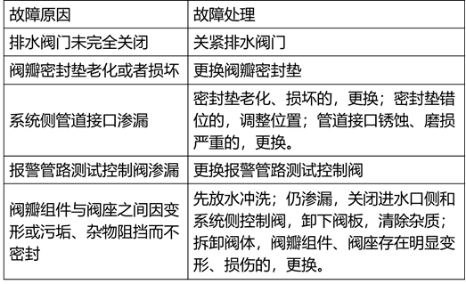 ①排水阀门未完全关闭②阀瓣密封垫老化或者损坏③系统侧管道接口滲漏④报警管路测试控制阀渗漏⑤阀瓣组件与阀座之间因变形或者污垢、杂物阻挡出现不密封状态 |