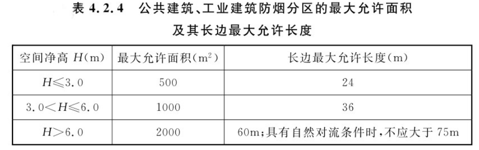 4-2-4 公共建筑、工业建筑防烟分区的最大允许面积及其长边最大允许长度应符合表4-2-4的规定,当工业建筑采用自然排烟系统时,其防烟分区的长边长度尚不应大于建筑内空间净高的8倍。